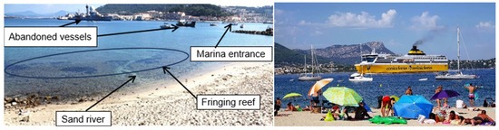 (left) The marina located south of La Vieille beach and the southern part of its fringing reef. (right) Beachgoers on La Vieille beach, anchored recreational boats and in the background a car ferry from Corsica, sailing towards the entrance of the port of Toulon. Photos © Dominique Calmet.
