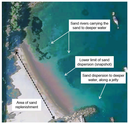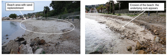 The P. oceanica meadows, including fringing reefs and barrier reefs, severely declined in many areas of the north-western Mediterranean from the early 20th century, e.g., near Genoa (Italy), Toulon and Marseilles (France), and Alicante (Spain), due mainly to coastal development, anchoring and bottom trawling (e.g., [32,33,34,35,36,37,38,39,40,41]). Pollution can also have a detrimental effect on P. oceanica [42,43,44,45], although its actual effect may have been overestimated [39,46,47]; the negative effect of pollution could be indirect, through overgrazing by fish and sea urchins attracted by nitrogen-enriched leaves and epibionts of P. oceanica [48,49]. Overgrazing by the sea urchin Paracentrotus lividus (Lamarck, 1816) and the fish Sarpa salpa (Linnaeus, 1758) has been considered as one of the key factors involved in the regression of the barrier reef of the Bay of Port-Cros (eastern Provence) [32,50,51,52,53]. Finally, artificial sand nourishment of beaches (also called ‘sand replenishment’) is often blamed for the decline of P. oceanica, as the sand washed away from the beaches buries the meadow and a layer of sand a few centimetres thick (from 4 cm), for three weeks to a few months, is enough to kill P. oceanica [54,55,56,57,58,59,60,61,62,63]. In addition, the washed sand increases the turbidity of coastal waters [22,64,65]. However, very little specific data exists on the subject of beach sand nourishment in the Mediterranean, showing impact or no impact [56,57,66]; the majority of references simply refer vaguely to sand nourishment. Beach nourishment is widely practiced worldwide, not only to combat the beach erosion but also to create artificial beaches [67,68]; it is a practice that is on the increase [68,69]. Beach replenishment is often considered a soft and environment-friendly solution, in any case preferable to the construction of groynes or riprap [70,71,72]. However, as in the Mediterranean, its effects on the beach and dune ecosystem as well as on subtidal ecosystems are conspicuous, although rarely considered or described [73,74,75,76,77,78,79].