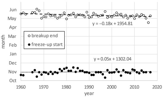 The freeze-up and end-of-breakup dates at the Fort Simpson gauge (gauge ID 10GC001) from 1960 to 2018 show a slight trend towards earlier end-of-breakup dates by approximately 18 days over a 100-year period, while freeze-up dates remain relatively constant with only a slight trend towards later dates, by 5 days over the same period (see Figure 2). The b-flags that accompany the daily flow readings indicate ice-influenced water-level recordings marking, respectively, the beginning and end of the river’s freeze-up and breakup periods. A similar analysis at the gauge at Strong Point (gauge ID 10FB006) from 1991 to 2018 aimed to determine if breakup occurred earlier upstream of Fort Simpson. However, the analysis by Lindenschmidt [] showed that an ice cover and its breakup can still persist upstream of Fort Simpson even if the Mackenzie River is already clear of ice at Fort Simpson. A b-flag analysis for the Liard River near its mouth compared 45 years (1973–2017) of breakup end dates recorded at the gauges at Fort Simpson and the Liard River mouth. The ice cover in the vicinity of the mouth of the Liard River persisted longer than the ice at Fort Simpson for only 5 years out of the 45-year series.