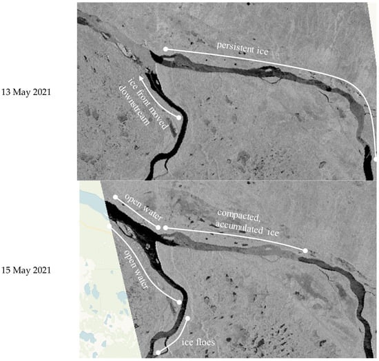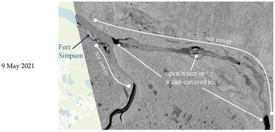 Sentinel-1 imagery showing the progression of the ice cover immediately before and also after the ice-jam flood peak (reached on 14 May 2021) at Fort Simpson (from []).