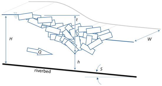 where g is the gravitational acceleration (m/s2), H is the backwater staging depth (m), Q is the discharge (m3/s), S is the slope (-) and W is the river width (m).