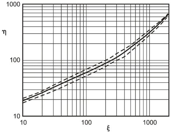 The relationship between ξ and η is shown graphically in Figure 5, which includes a confidence band to reflect the range of variation within ξ and η due to differences in ice characteristics and fluvial geomorphology.