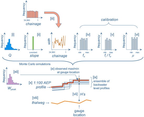 The process is repeated 100s of times to yield an ensemble of ice-jam profiles (see [d] in Figure 7). The profile ensemble can be summarized using percentiles of the water-level elevations at each chainage. For instance, the 99th percentile corresponds to the 1:100 AEP (indicated by [x] in Figure 6 and [e] in Figure 7). The parameters fo, fi/fo and μ (respectively, [iv], [v] and [vi] in 6) are adjusted until the percentile profiles ([x] in Figure 6) pass through the corresponding observed return period (see [xi] in Figure 6 and [f] in Figure 7), which are derived from the water-level elevations recorded at the gauge (see [xii] in Figure 6).