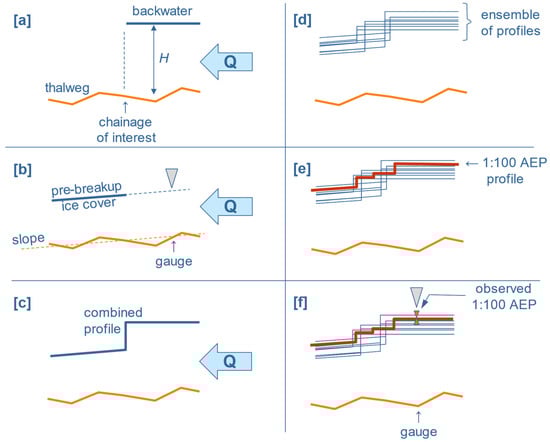 Construction of ensemble of ice-jam profiles to derive an ice-jam flood hazard profile: [a] backwater elevation extended upstream, [b] downstream profile follows thalweg slope, [c] combining upstream and downstream profiles at each chainage, [d] creation of ensemble of profiles, [e] estimate return period/probability of every flood profile and [f] comparison with observed AEP level at the gauge.