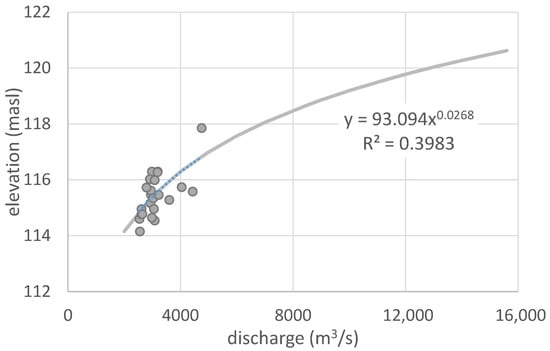 The water-level profile downstream from the chainage location runs parallel to the thalweg slope (see [b] in Figure 7). The elevation of the downstream portion of the profile is such that it can pass through the elevation determined from the derived under-ice rating curve at the gauge (see Figure 8). The two profiles are then combined to form an ice-jam profile (see [c] in Figure 7).