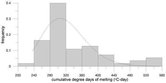 Log-normal distribution fit to observed cumulative degree days of melting, beginning 1 April, until breakup for the years 1965 to 2021.