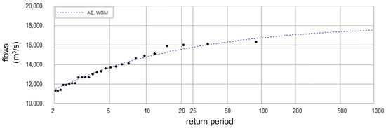 The location and scale parameters of the CDDM distribution were slightly adjusted to remove the bias between simulated and observed end-of-breakup flow distributions. Simulated historical end-of-breakup flows were obtained from previous studies [,] that simulated flows of the Mackenzie River basin using a MESH (Modélisation Environnementale Surface et Hydrologie) model (https://research-groups.usask.ca/hydrology/modelling/mesh.php (accessed on 23 July 2025)). The study incorporated a 15-member ensemble of the Canadian Regional Climate Model (CanRCM4) downscaled from the Canadian Earth System Model (ESM2) and resulted in 15 sets of flow. This adjustment was based on comparing all simulated flows from the 15 modeled flows with the observed flows for 1981 to 2005.