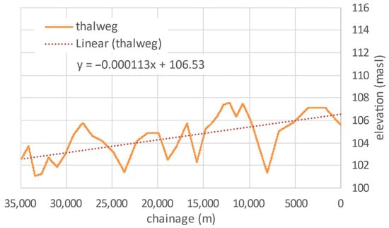 - pre-breakup ice-cover water level extending from the same chainage location in the downstream direction with the same slope as the thalweg.