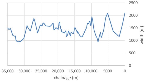 The bathymetric survey consisted of 34 cross-sections along the Mackenzie River extending over a course of 34.9 km. River widths were extracted from each cross-section and interpolated into locations between the cross-sections. The variation in width along the chainage of the studied river reach is shown in Figure 12.