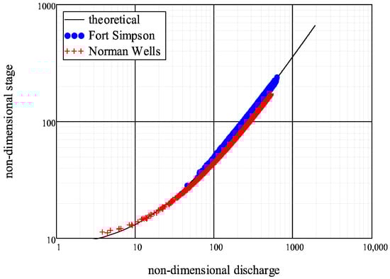 The ranges in the non-dimensional discharge ξ and stage η are depicted alongside the theoretical η = f(ξ) in Figure 13. For comparison, the results for Norman Wells, situated more than 600 km downstream of Fort Simpson, are also included from another study []. The theoretical line provides a large range of non-dimensional discharge vs. stage values. The cluster of values calculated for Fort Simpson is higher than that of Norman Wells, due to fluvial geomorphological differences between the two sites. The Mackenzie River at Fort Simpson is narrower and more sloped than at Norman Wells potentially leading to a higher severity of ice jam floods at Fort Simpson.