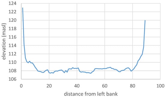 To determine the geodetic elevations of the backwater levels, the values of H are added to the geodetic elevation of the thalweg. For example, the cross-section surveyed at the gauge located at Fort Simpson is illustrated in Figure 14.