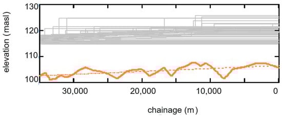 In order to create ice-jam profiles (see [ix] in Figure 6), for each profile, the backwater elevation was extended from its chainage in the upstream direction (see [a] in Figure 7). The profile upstream of the jam should slope upward; however, the length of the ice jam cannot be calculated. Hence, the backwater profile was assumed to remain horizontal, which may introduce an underestimate of the hazard profiles. This underestimate can be compensated for by slight increases in the calibration values of the friction coefficients.