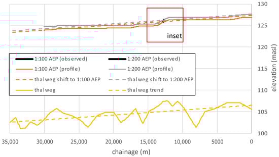 Profiles of 1:100 and 1:200 AEP for the reach at Fort Simpson; a zoom into the inset is provided in the next figure.