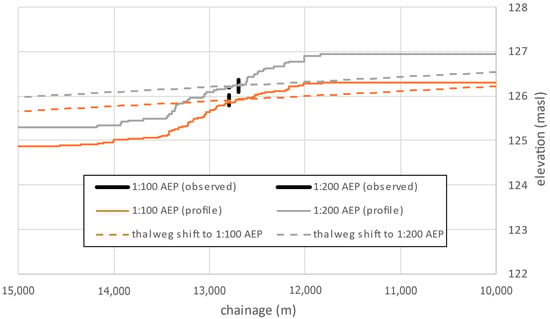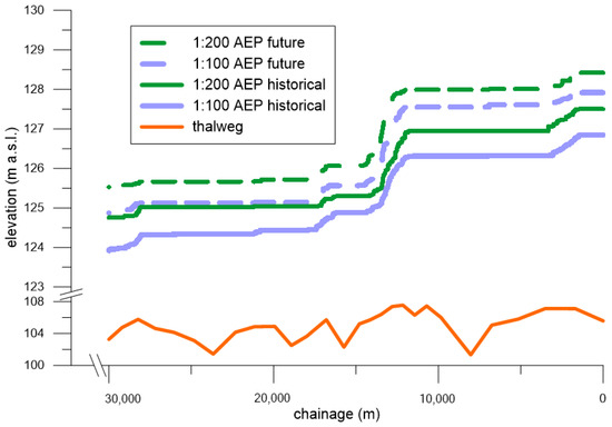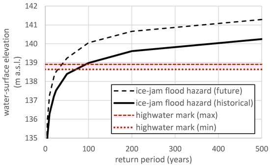 Ice-jam flood hazard was compared between the status quo (historical: 1997–2021) and the impacts caused by climate change (future: 2076–2011). We are not accounting for changes in ice properties due to climate change, only changes in the climate and hydraulic regimes. The distribution of the status quo breakup flows was shifted for the future timeframe using the methodology presented in Dehghani Sanij et al. []. Figure 18 shows the shift to higher ice-jam flood hazard, indicated by the 1:100 and 1:200 AEP profiles, for the future 2076–2100 period, compared to the historical 1997–2021 period.