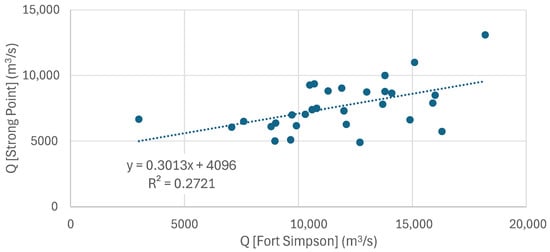The ice-jam flood hazard assessment was extrapolated to the ungauged reach of the Mackenzie River at the community of Jean Marie River upstream of Fort Simpson. The extrapolation was carried out similar to the methodology laid out in Lindenschmidt et al. []. One difference applied here was replacing the breakup flow distribution with a distribution of the fraction of the breakup flows recorded at Strong Point to those recorded at Fort Simpson. The flow at Fort Simpson is constituted by both the flows from the Liard River, which flows into the Mackenzie River just upstream of Fort Simpson, and the (upper) Mackenzie River flows upstream of the Liard River mouth. At breakup, the upper Mackenzie River contributed, on average, approximately 65% (a fraction of 0.65) of the flows at Fort Simpson, with the distribution shown in Figure 19. The remaining flows stem from the Liard River. The correlation between the two flows at breakup is low (r2 = 0.27), as indicated in Figure 19. This is due to the differing ice regimes from year-to-year at the Mackenzie/Liard River confluence. Lindenschmidt [] compared the breakup end dates at Strong Point with those at Fort Simpson and determined that the breakup does not always occur earlier at Strong Point than at Fort Simpson itself. In some years, ice sheets and accumulations still persist upstream of the confluence even though the ice cover at Fort Simpson has broken up. The b-flag analysis was also carried out for flow records of the Liard River near its mouth. By comparing 45 years (1973–2017) of breakup end dates recorded at the gauges at Fort Simpson and the Liard River mouth, it was found that for 5 years out of the 45-year series the ice cover in the vicinity of the mouth of the Liard River persisted longer than the ice cover at Fort Simpson.