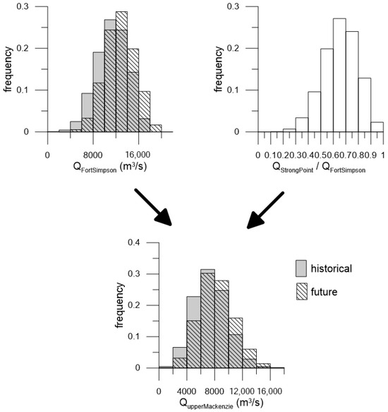 Distributions of flows at Fort Simpson (upper left) and the upper Mackenzie River (bottom) using the flow faction distribution (upper right); all distributions stem from values generated randomly from GEV distributions.