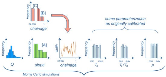 Adjustments to the distributions to accommodate changes in [A] bed slope along the reach, [B] varying propensity to ice-jam lodgments along the reach and [C] mitigation measures to remove ice-jam lodgments in certain sections of the reach.