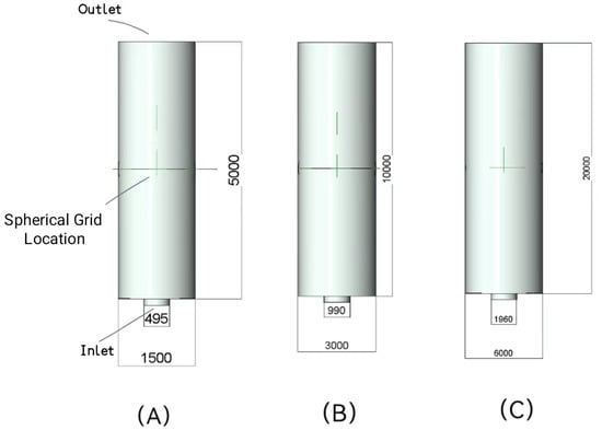 The specific structural parameters are as follows: the heights are set as H1 = 5000 mm, H2 = 10,000 mm, and H3 = 20,000 mm; the radii of the bottom inlets are d1 = 495 mm, d2 = 990 mm, and d3 = 1960 mm; the diameters of the central flexible Spherical Grid Structures are D1 = 1500 mm, D2 = 3000 mm, and D3 = 6000 mm. The spherical centers are positioned at the geometric midpoints of both the height and diameter dimensions. A pair of parallel flexible screen plates is arranged along the diameter, with their distance from the spherical center measured in the radial direction away from the sphere’s core. The small holes on both the flexible Spherical Grid Structures and the screen plates have a diameter of R4 = 50 mm. Based on these dimensional specifications, a mathematical model experiment was constructed, as illustrated in Figure 1.