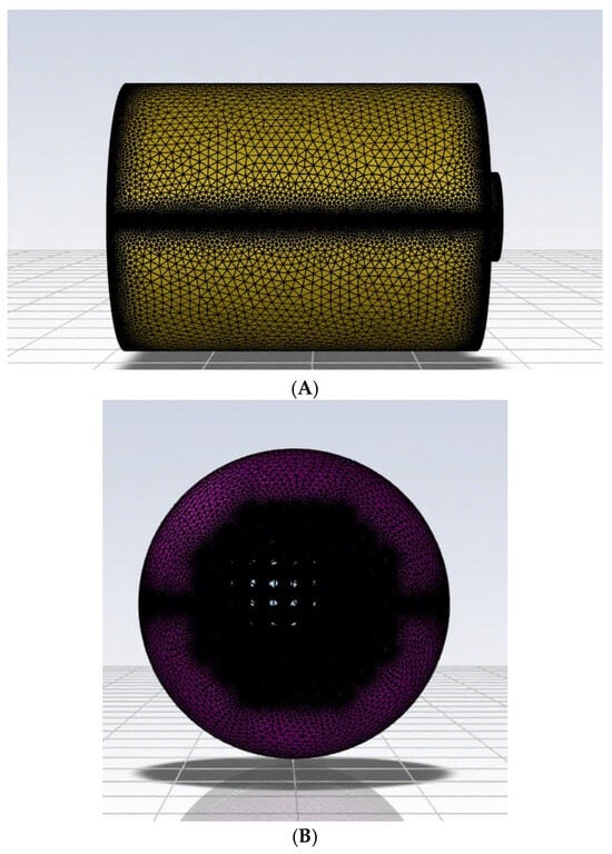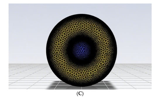The computational domain includes the fluid flow region of a Spherical Grid-Structured microporous aeration bioreactor. In order to assess the effect of the structural optimization on the oxygen mass transfer efficiency, comparative simulations with and without the Spherical Grid Structure configuration were performed. Given the geometrical complexity of membrane-type microporous diffusers (pore sizes of 0.1–0.75 mm), the model was simplified in this study by considering only gas chambers and omitting individual micropores. The mesh generation was performed using Fluent Meshing 2020 R1 to construct structured hexahedral cells (Figure 3). To ensure computational accuracy, localized encryption is applied to the entrance area and the structural surface of the spherical mesh []. The overall mesh (A) exhibits a geometrically adaptive topology, the encrypted mesh near the spherical mesh (B) significantly improves the resolution of the boundary layer, and the refinement of the inlet region (C) accurately captures the initial flow characteristics. The mesh quality meets the numerical stability requirements: the maximum skewness is lower than 0.85, and the minimum orthogonal quality is higher than 0.15. The independence of the grids was rigorously verified by parameter variations (Table 1): the deviations of the main hydrodynamic parameters (velocity, pressure, and turbulent kinetic energy) were less than 1% for all three grid resolutions (minimum sizes 0.030625–0.050625 m), confirming that the effect of numerical errors is small. Using the Richardson extrapolation method to calculate the GCI, for the smallest grid sizes of 0.030625 m and 0.040625 m, the GCI of the flow velocity is 0.87%, the GCI of the pressure is 0.52%, and the GCI of the turbulence kinetic energy is 0.63%, which are less than 1% and satisfy the accuracy requirement of a GCI < 5% in the engineering calculations.