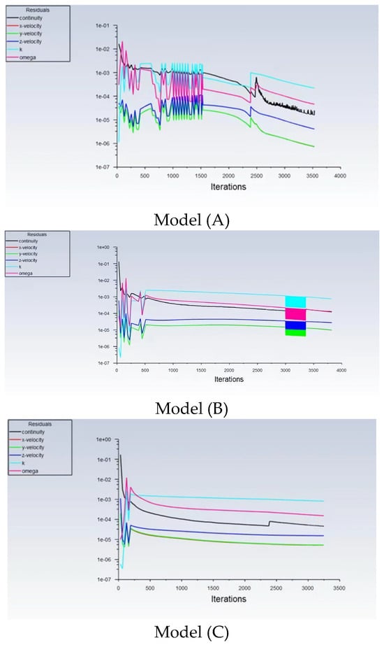 As shown in Figure 4, the transient convergence curves of the three models exhibit excellent stability. For Model (A), the transient curve oscillates regularly below 1 × 10−2, then declines steadily before stabilizing after a brief spike. Model (B) remains below 1 × 10−2 after initial oscillations, displaying a downward trend with periodic fluctuations. Model (C) follows a similar trend to Model (B) in the early stage, maintaining a steady decline. The continuity residuals remain below 1 × 10−4, and all parameters stabilize, confirming a convergence. The absence of significant oscillations in the curves indicates a robust convergence for all models.