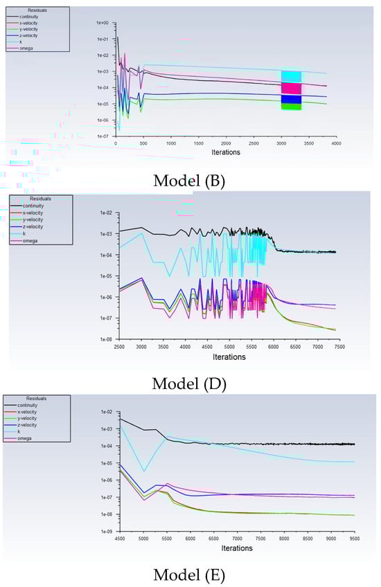 Figure 5 demonstrates the transient convergence behavior of Models (B), (D), and (E). Model (B) remains below 1 × 10−2, with periodic fluctuations and a declining trend. Model (D) stabilizes after regular oscillations below 1 × 10−2, while Model (E) exhibits a single fluctuation around 1 × 10−3 before continuing its downward trend.