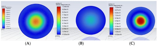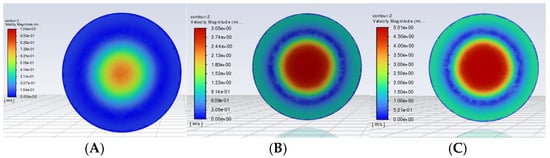 The velocity contour plot of cross-section No. 1 parallel to the XOY plane at Z = 1 m when the time is t = 200 s. (A–C) correspond to the radii of the small holes of the Spherical Grid-Structured reactor as RA = 30 mm, RB = 50 mm, and RC = 80 mm, respectively.