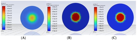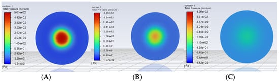 The pressure contour plot of the aerated biological reactor model with a Spherical Grid Structure. (A–C) correspond to the radii of the small holes of the Spherical Grid-Structured reactor as RA = 30 mm, RB = 50 mm, and RC = 80 mm, respectively.
