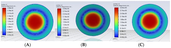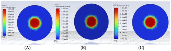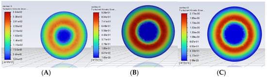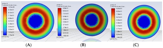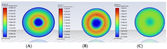 Velocity contour plots for different radii are shown in Figure 6A–C, pressure contours are in Figure 7A–C, and turbulent kinetic energy distributions are in Figure 8A–C. The color intensity in the contours correlates positively with the physical quantity magnitude: darker shades in velocity plots indicate higher flow velocities, deeper tones in pressure plots signify greater pressure drops, and richer hues in turbulent energy plots denote stronger local turbulence. Th analysis shows that at R = 50 mm, the velocity distribution is most uniform, pressure gradients are moderate, and the turbulent kinetic energy exhibits a uniform distribution, indicating optimal flow stability.