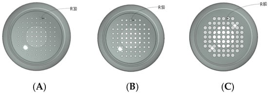 (A–C) correspond to the radii of the small holes of the Spherical Grid-Structured reactor as RA = 30 mm, RB = 50 mm, and RC = 80 mm, respectively.