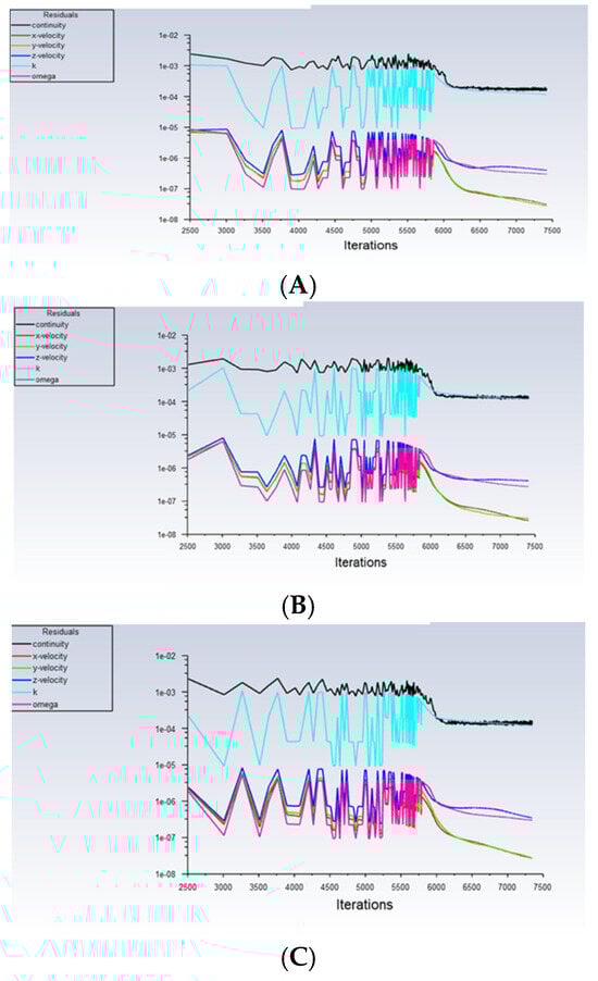 The transient calculation convergence curves of the aerated biological reactor model with a Spherical Grid Structure. (A–C) correspond to the radii of the small holes B of the Spherical Grid-Structured reactor as RA = 30 mm, RB = 50 mm, and RC = 80 mm, respectively.
