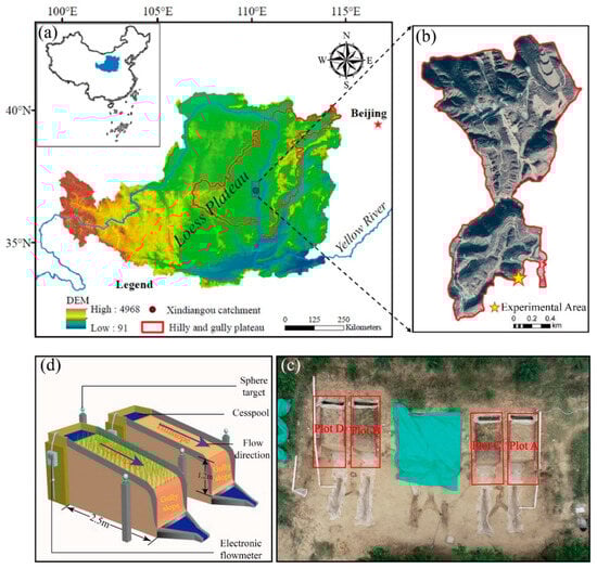 Study site and the experimental design. (a) Geographical location of the hilly–gully area on the loess plateau; (b) Schematic map of the Xindiangou watershed; (c) Top view of the experimental plot; (d) Three-dimensional schematic of the experimental plot.