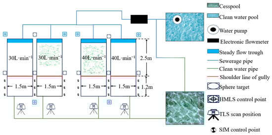 where is the discharge flow rate (L/min), is the width of the experimental plot (m), is the width of the upstream (m), is the rainfall intensity (mm/min), is the upstream area (m2), is the gradient of the hillslope (°), is the run-off coefficient. Considering the specifics of the experiment, , , , were set as 1.5 m, 5 m, 0.3–1.2 mm/min, 300–400 m2, was set 16°, was set 0.32–0.57. According to the results of the calculations, the input flow rates for Plot A and Plot C were set to 40 L/min, which represented the surface runoff rate under large rainfall conditions. The input flow rates for Plot B and Plot D were set to 30 L/min, which represented the surface runoff rate under conventional rainfall conditions (Figure 2).