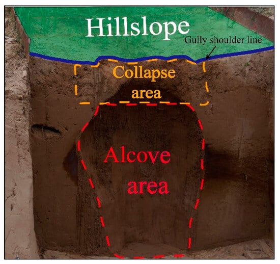 The resulting topography after scouring experiment was shown in Figure 3. The upper part of the gully slope was found to be susceptible to mass movement, which primarily manifested as collapse; this area was subsequently defined as the collapse area. Meanwhile, the lower part of the gully slope was often undercut by hydraulic erosion, leading to the formation of an inward-hollowed cavity. This region was defined as the alcove area (Figure 3).