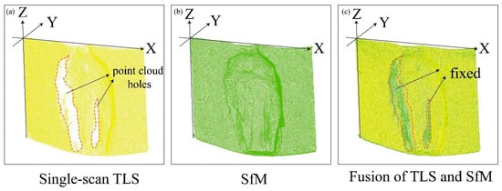Different types of point cloud data. (a) Single scan TLS point cloud; (b) SfM point cloud; (c) Fused data of Single scan TLS and SfM.