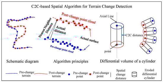 The Cloud-to-Cloud (C2C) algorithm enables rapid calculation of distances between point clouds by directly comparing two point cloud datasets, allowing for a fast and straightforward analysis [49,50]. It employs nearest neighbor search methods, such as the Hausdorff distance and k-d trees, to find the closest point in the reference point cloud for each point in the compared cloud (Figure 6). The core concept is to discretize the volume of change between the reference and compared point clouds into numerous small cylinders, with each cylinder containing only a single point from the target cloud. The C2C distance for a target point, which is an unsigned value (i.e., absolute distance), is defined as the height of its corresponding cylinder. The base area of this cylinder is defined as the reciprocal of the local point cloud surface density. The final formula for the volume of change is then derived from Equation (3):