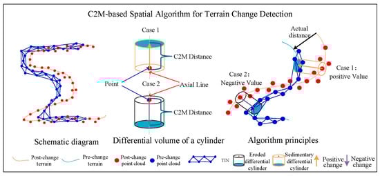 The Cloud-to-Mesh (C2M) algorithm is currently one of the most commonly used algorithms for topographic change detection [51]. Unlike the C2C algorithm, C2M calculates the spatial distance by comparing each point in a point cloud to the nearest triangle in a reference mesh/model (Figure 7). The distance between the point cloud and the mesh is derived from Equation (4):