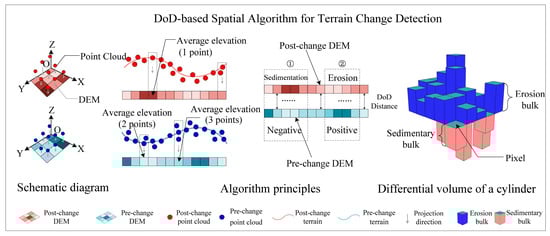 The DEM of Difference (DoD) algorithm was first applied to the field of topographic change detection by Lane et al. [52]. Its core principle involves interpolating the reference and target point clouds into separate DEMs and then calculating the difference between the two DEMs on a cell-by-cell basis (Figure 8). The volume of change is derived from Equation (5):