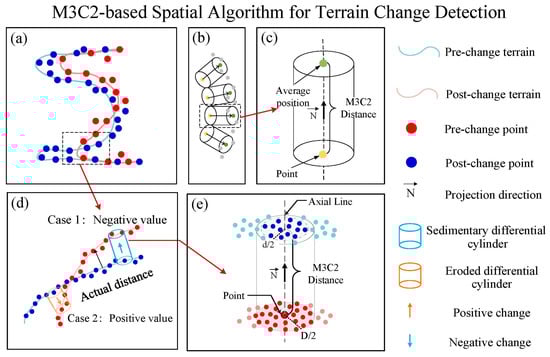 Illustration of M3C2 algorithm. (a) Reference point cloud and comparison point cloud; (b) Cylinder creating; (c) Distance calculation; (d) positive and negative terrain changes determining; (e) M3C2 distance.