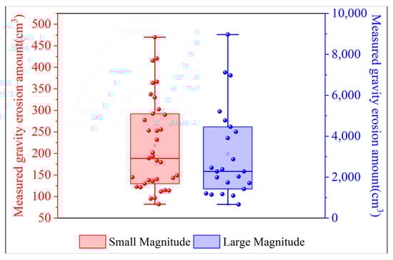 A total of 58 gravity erosion samples were collected from the four experimental plots. The number of large and small gravity erosion samples were 23 and 35, respectively (Figure 10). For the small-magnitude gravity erosion samples, the maximum and minimum values were 469.7 cm3 and 82.1 cm3, respectively, with a mean value of 218.2 cm3. For the large-magnitude samples, the maximum and minimum values were 8967.7 cm3 and 666.0 cm3, respectively, with a mean value of 3132.8 cm3.