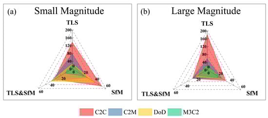 For the small-magnitude gravity erosion samples, the quantification accuracy of the M3C2 algorithm performed the best among different data sources (Figure 13). Among these, the fused TLS and SfM data was the most precise one in the three data sources, with mean relative errors of 13.32%. The calculation accuracy of the four algorithms using the fused TLS and SfM data for the large-magnitude gravity erosion were all relatively high, with the mean relative error ranging from 13.32% to 38.17%. The quantization accuracy of the M3C2 algorithm was basically similar under the two types of magnitudes and obviously larger than that of the other algorithms. By contrast, the mean relative error of the C2C algorithm using the TLS data was the largest for small-magnitude samples (137.28%) and large-magnitude samples (181.25%), while the error is reduced to 31.67% and 26.05% by point cloud fusion, respectively. In addition, the difference in quantitative accuracy of large-magnitude gravity erosion for the C2M, DoD and M3C2 algorithms was relatively small under different data sources. However, there are obvious differences in the quantization accuracy of small-magnitude gravity erosion among different algorithms. Overall, the fused TLS and SfM data combined with the M3C2 algorithm presented good monitoring accuracy on the two magnitudes of gravity erosion.