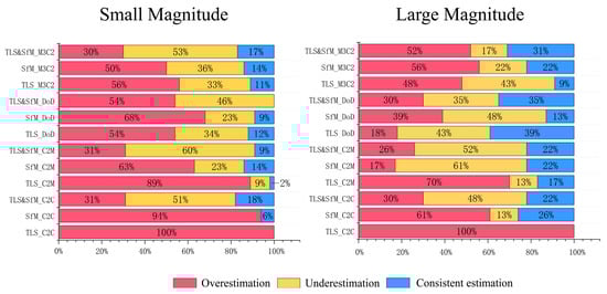 The consistent estimation (CE) rate of large-magnitude samples by different algorithms was generally higher than that of the small-magnitude samples based on the same data sources (Figure 14). For the small-magnitude samples, the CE rate (17%) was the highest using fused TLS and SfM data and M3C2 algorithm. The CE rate of the C2C algorithm was 0% using the single-source data (TLS and SfM), which rises to 17% by data fusion. The CE rate (14%) of gravity erosion quantification based on the C2M algorithm and SfM data was much higher than the other data, while the combination of DoD algorithm and TLS data showed the larger CE rate at 11%. Moreover, the C2C (51% of the samples were underestimated), C2M (60% of the samples were underestimated) and M3C2 (53% of the samples were underestimated) combined fused data tended to underestimate gravity erosion amount, while the combination of the remaining data types and algorithms tended to overestimate erosion volume. Especially, a combination of C2C and TLS data/SfM data produced the highest percentage of overestimation (100% and 94%, respectively). For the large-magnitude samples, the C2C plus TLS data/SfM data also yielded the relatively high overestimation rates of 100% and 61%, respectively. The M3C2 algorithm plus TLS data yielded the highest CE rate (39%) among all the algorithms at the large magnitude, which even exceeds the CE ratio of corresponding fused data. Similarly, the accuracy of C2C algorithms and SfM also exceeded the accuracy of C2C plus fused data. In contrast, the CE ratios (31%) of M3C2 algorithm combined with fused data was higher than that of SfM data (22%) and TLS data (9%). Moreover, the C2M algorithm plus SfM data/fused data tended to seriously underestimate the gravity erosion, with underestimated samples accounting for 61% and 52% of the total, respectively, whereas the C2M algorithm plus TLS tended to overestimate erosion volume, with underestimated samples accounting for 70% of the total.