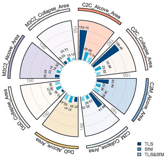 The quantization accuracy of DoD algorithm based on the data derived by TLS perform best in the collapse area, with a mean relative error of 13.48% (Figure 15). The C2C plus TLS data yielded the largest mean relative error (159.48%). In contrast, the C2C plus fused data presented had a relatively low mean relative error (23.82%), which was much lower than that of C2C plus TLS data/SfM data. For the alcove area, the highest accuracy was achieved by the M3C2 algorithm plus fused data, the relative error reached 14.53%. Similarly to the collapse area, the C2C plus TLS data gave the worst quantification accuracy, with a mean relative error of 153.15%. Additionally, the mean relative error of C2M plus TLS data was all relatively high in both the collapse area (86.74%) and the alcove area (63.46%). This were apparently higher than that of the C2M plus SfM data/fused data. Overall, the M3C2/DoD method and various data sources could produce relatively higher quantification accuracy than other strategies under different geomorphic units. Specifically, the DoD algorithm plus TLS data was suitable for quantifying gravity erosion in collapse areas, while the M3C2 algorithm plus TLS data performed better in alcove area.