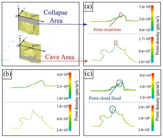 Our study found that the accuracy of most of the fused data was generally higher than that of the single-source data (Table 1). This is because the blocking of vegetation or terrain as well as the light factor will affect the accuracy of single data source, especially for the complex terrain areas [53,54]. This will inevitably produce holes or sparse point cloud areas (Figure 16), thereby affecting the quantization accuracy of the different algorithms. The fused point cloud data can compensate to some extent for the sparse or empty areas in the single-source point cloud data [55]. Moreover, the increase in point cloud density resulting from data fusion is also an important factor affecting the calculation accuracy of gravity erosion. Some other studies also found that the fused data of LiDAR and photogrammetry performed much better in gravity erosion quantization than single-source data based on the field survey results [55,56]. This is consistent with our findings. In addition, the discrepancy in quantization accuracy of gravity erosion was detected between the four algorithms for different terrain units of the gully slope (i.e., collapse areas and caves areas). The DoD algorithm plus TLS was subject to the lowest mean relative errors (13.48%) in the collapse area. In contrast, the quantification accuracy of the M3C2 algorithm in the alcove area was higher than that of DoD, which is inconsistent with the accuracy results of the collapse area. Compared with alcove areas (characterized by terrain mutation areas and complex terrain areas such as both sides of the collapse area), the terrain of the collapse area is relatively simple. Previous researchers showed that the DoD algorithm worked poorly in complex terrain because the problem of elevation overlap cannot be completely avoided [57,58,59], whereas the M3C2 algorithm effectively avoids the repetitive projection issue of the DoD algorithm [60]. Hence, the accuracy of this algorithm is slightly higher than that of the DoD in the alcove area.