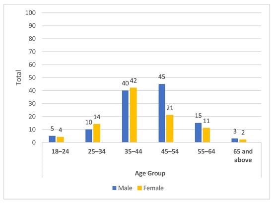 In the younger age cohort of 25–34, female participation is notably higher, with 14 females compared to 10 males. This suggests that young women are more engaged in community-oriented or academic surveys. However, this trend shifts in older age categories. For instance, in the 45–54 age group, males significantly outnumber females (45 males vs. 21 females), making up nearly two-thirds of that segment.