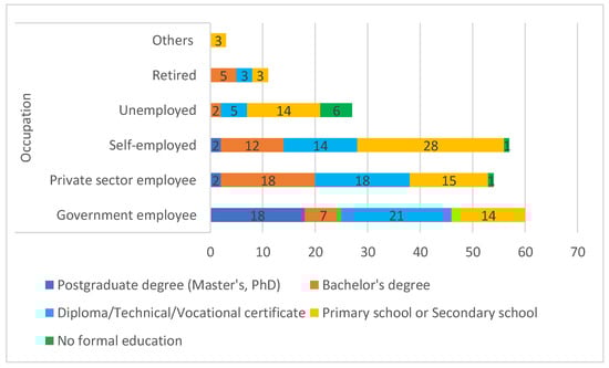 Figure 3 illustrates the distribution of educational attainment across various employment categories, offering insights into the socio-demographic characteristics of participants in this urban flood preparedness survey. A substantial proportion of respondents, particularly those employed in government and private sectors, possess higher education qualifications, including Bachelor’s and Postgraduate degrees. This trend reflects not only the formal education requirements associated with structured employment but also suggests that these individuals may have a greater capacity to engage in community-based disaster preparedness initiatives.