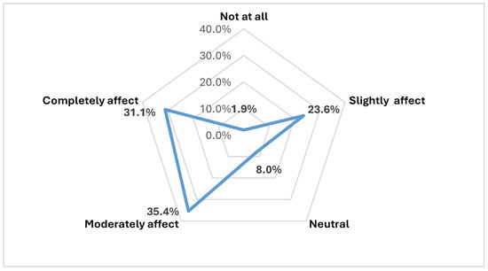 Respondents reported varying degrees of impact that urban floods have on their quality of life, as illustrated in Figure 4. Respondents were asked the following question: “To what extent do urban floods impact your quality of life?” using a 5-point Likert scale from 1 (not at all) to 5 (completely affected). A significant proportion, 35.4%, indicated that floods moderately affect their quality of life, while 31.1% reported that it is completely affected. This highlights that nearly two-thirds of respondents experience a substantial disruption due to flooding. Additionally, 23.6% felt that floods had a slight impact on their quality of life, whereas a smaller fraction remained neutral (8%) or indicated no impact (1.9%). These findings emphasise the tangible burden of flood events on daily living conditions, pointing to the need for more targeted preparedness and mitigation strategies to reduce such impacts. This finding echoes the concerns from a previous study [35], which noted that flood events intensify daily insecurities and should be considered a crucial part of the risk landscape that communities encounter. The considerable level of disruption underscores the need for policies that integrate flood management into urban socioeconomic planning.