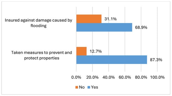 The extent to which respondents have taken proactive steps to reduce flood impacts is presented in Figure 5. Respondents were asked two separate yes-or-no questions to evaluate their readiness, specifically whether they had implemented property protection measures and whether their property was insured against flood damage. A substantial majority, 87.3%, reported having taken specific measures to prevent and protect their properties from flooding, reflecting a strong sense of personal responsibility and risk awareness. In contrast, regarding insurance coverage against flood damage, only 68.9% were insured, leaving 31.1% without coverage and exposed to potentially devastating economic losses. It is important to understand that flood insurance coverage options are limited and can significantly increase the financial burden on individuals. Most available flood insurance primarily protects physical assets, such as vehicles, depending on the type of premium purchased. Consequently, many households affected by floods often depend on post-disaster assistance, including financial aid from the government.