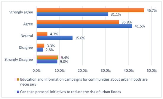 Respondents’ perspectives on two key dimensions of flood preparedness, the necessity of community education campaigns and their own personal initiatives, are illustrated in Figure 6. A notable 46.7% strongly agreed that education and information campaigns are essential, with another 35.8% agreeing, which reflects widespread recognition of the importance of public awareness in mitigating urban flood risks. In contrast, while personal action was also viewed positively, only 31.1% strongly agreed, and 41.5% agreed that they can take personal initiatives to reduce flood risk. A larger proportion (15.6%) remained neutral about taking action, suggesting a gap between awareness and behavioural response. These findings emphasise the importance of connecting information dissemination with community empowerment and the motivation to take action. The gap between awareness and individual action highlights the need for strategies that not only encourage behaviour change but also strengthen community-based initiatives for ongoing empowerment.