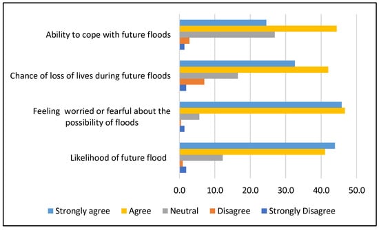 Respondents’ perception of urban flood risks across four dimensions, likelihood of future floods, emotional concern, perceived threat to life, and confidence in coping, is illustrated in Figure 7. A significant proportion of respondents expressed strong agreement (45%) and agreement (43%) with the likelihood of future flood occurrence in their area, underscoring heightened awareness of flood risks. Similarly, concern about floods was high, with over 85% agreeing or strongly agreeing that they felt worried or fearful about potential flood events. Regarding the perceived risk of losing lives, 42% agreed, and nearly 33% strongly agreed, indicating a significant concern for personal and community safety during future floods. In contrast, confidence in coping showed a more varied distribution. Over 40% agreed, and almost 25% strongly agreed that they could manage flood situations. A notable 27% remained neutral, while a small segment expressed disagreement, reflecting differing levels of self-efficacy in responding to floods. Residents recognise the potential for flooding and the danger it poses, yet they also feel confident in their ability to handle the situation. Past findings also indicate that previous flood experience can enhance awareness of risks and may cultivate a sense of confidence in addressing future events [42].