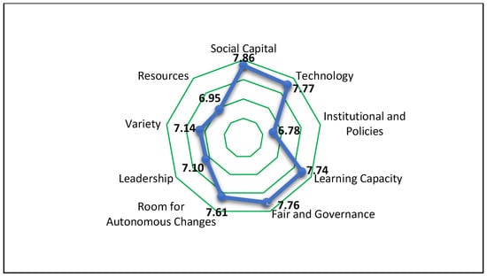 Adaptive capacity is assessed using a multidimensional framework comprising nine key indicators, including social capital, governance, technology, leadership, and others. It is calculated as a composite mean index derived from aggregated subcomponent scores. Unlike the average Likert score presented in mean score analysis, this section presents the adaptive capacity index, which reflects an integrated assessment across multiple dimensions. The analysis of the mean index values for adaptive capacity reveals generally positive perceptions across all components. However, substantial variation exists among the subconstructs, as illustrated in Figure 8.